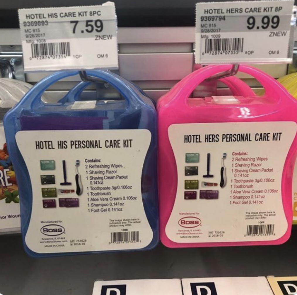 Pink taxes: the extra money women spend for similar products or services that are applied to men as well. We already know that there is a gap between how much women make and how much men make ($0.77 per $1 a man makes), but what we are blindly missing is how much more money women are paying for daily necessities that men could use as well.
