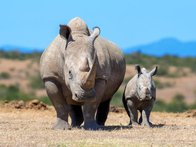 Rhinos mostly eat bushes and other kinds of vegetation, and they have no natural predators except for crocodiles, hyenas, big cats, and african wild dogs that may prey on the baby creatures.