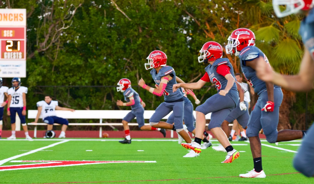 The 2-0 Junior Varsity (JV) high school football team, the Key West High School (KWHS) Conchs, played their third game this season on October 14th in the KWHS Backyard. Up against the Fighting Conchs, the University School, located in Fort Lauderdale, Florida, brought down their Shark spirit to our territory.
