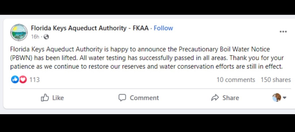 Even though the breaks in the water pipe have been fixed, the FKAA has put out a notice to boil water. It is a precautionary measure for MM 90 and south, since the water coming from the pipes could have bacteria in it. The boil water notice is scheduled to be lifted on Wednesday, March 15. However, the lift date could be pushed to a later date.