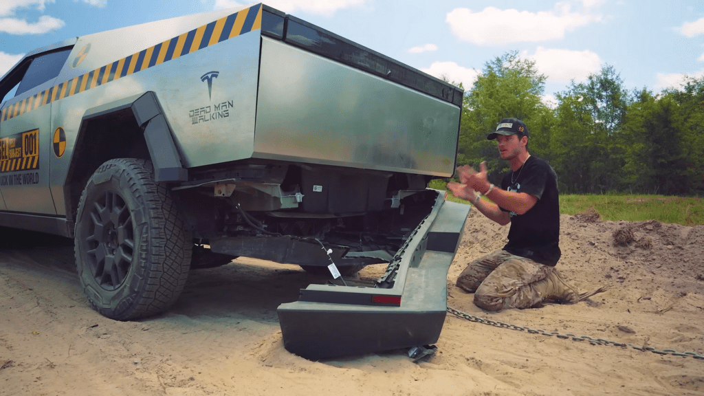 The destroyed frame of a Tesla Cybertruck filmed during a WhistlinDiesel video testing its durability in comparison to a standard Ford F150. (WhistlinDiesel/Cody Detwiler)