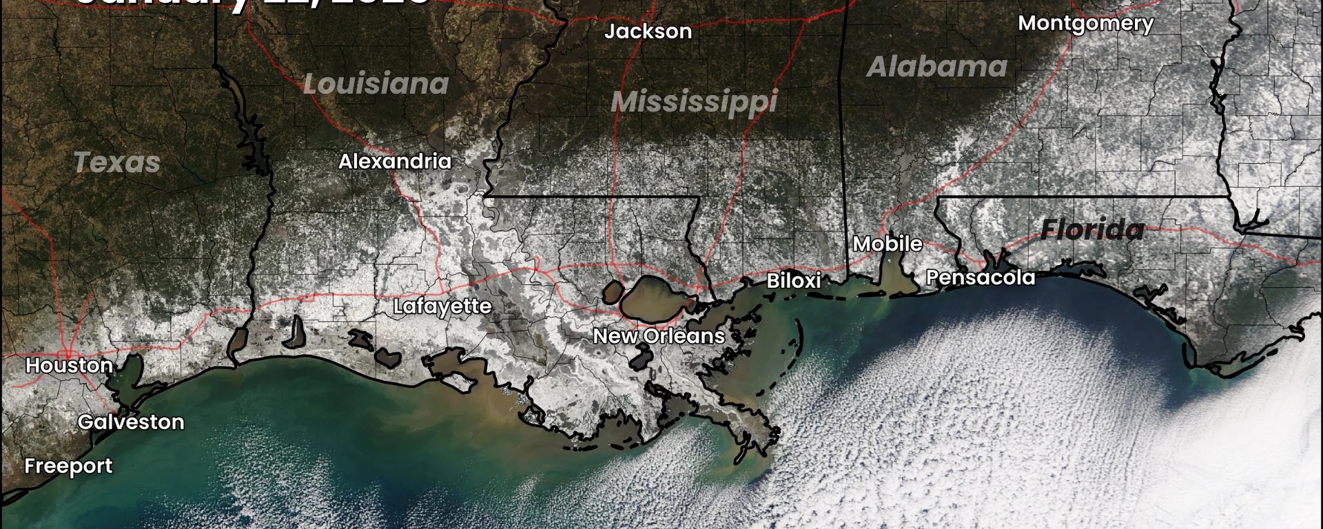 Satellite imagery from January 22, 2025, showing historic snowfall coating much of the US Gulf Coast and Georgia. (NOAA)